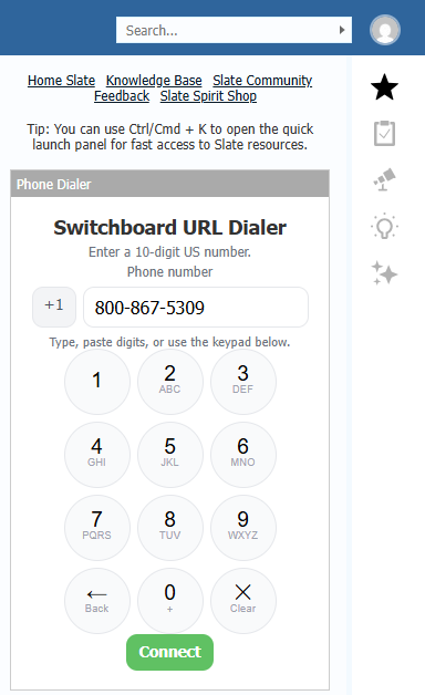 The dialer: This phone dialer lives in a User Dashboard that is accessible in your Quick Launch Panel. Key in a phone number and hit 'Connect'. It will open the Slate Voice switchboard interface with the eligible number entered into the URL parameters.