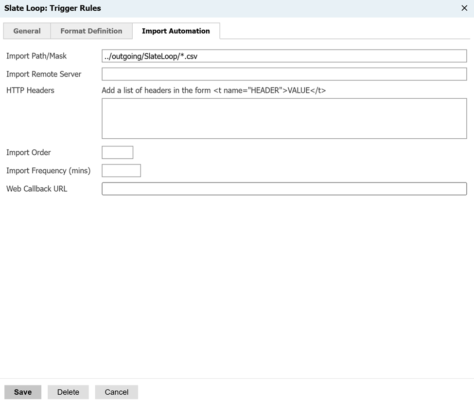 We recommend writing the import path/mask to accommodate different file names for different trigger exports, so use the ../outgoing/SlateLoop/*.csv wildcard structure. The folder is the most important - and including the ../ to pull from the outgoing SFTP directory.
