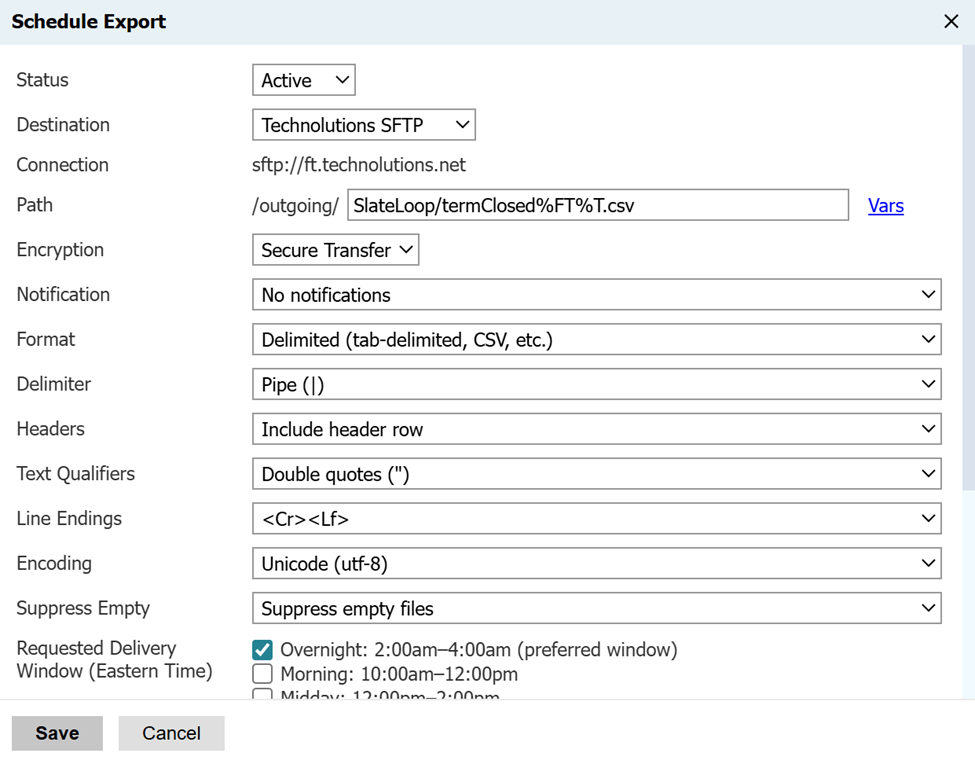 Click on Schedule Export and send the file to a custom Outgoing folder - but choose a common name that you can use for other Trigger Refresh exports. Make sure the file name ends in .csv, too. We recommend naming the file with timestamps, changing the delimiter to Pipe, setting the priority to low, and sending it each day of the week. Important: You will want to click "Suppress empty files".