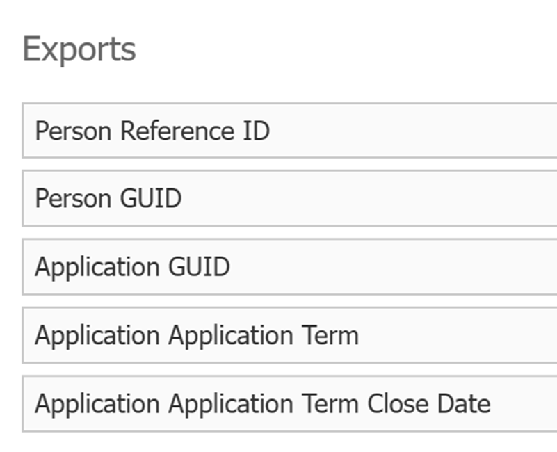 If you're triggering an update for an application record - which is most common - you will only need to use the Application query base, a Person GUID export, and an Application GUID export. (If you're triggering an update for a Person record, it is important to note that Upload Dataset requires at least two columns of data, so you'll need at least two exports.)