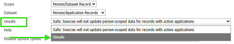 Just like with editing person-scoped fields or default person-related tables, if a record has anย application attached to it, the person-scoped entities are now considered "safe" by default. However, many entities areย designed to attach to the person and be continuously updated long after the application exists - so you need to toggle the "unsafe" controller!